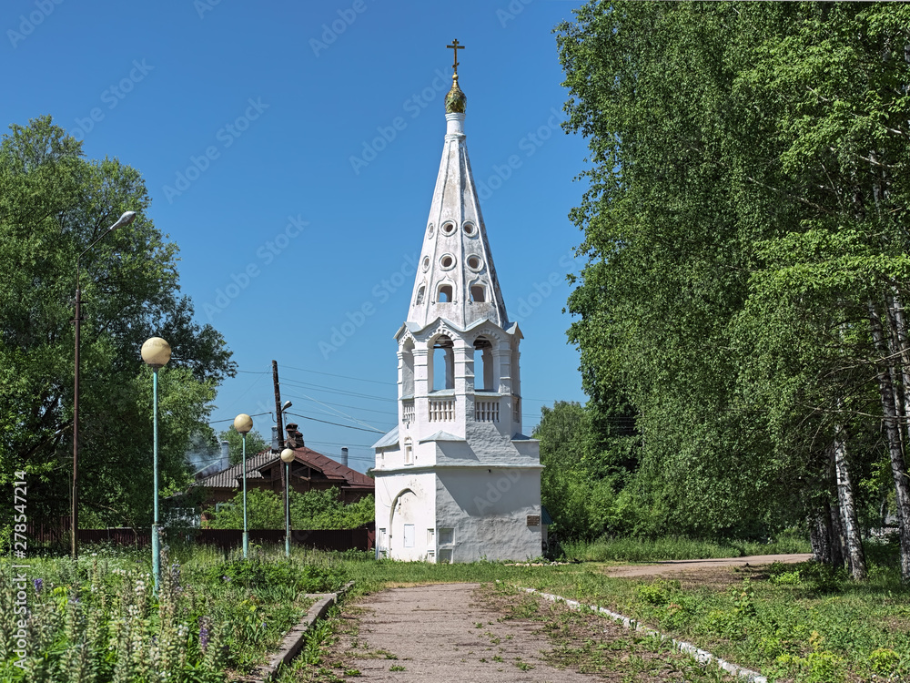 Belfry of Presentation Church in Bezhetsk, Russia. The belfry, built in 1680-1682, is the oldest surviving town's building and the only existing part of Monastery of Presentation of Virgin Mary.
