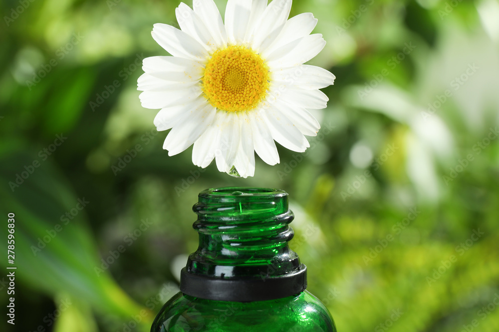 Essential oil dripping from chamomile flower into glass bottle on blurred background, closeup