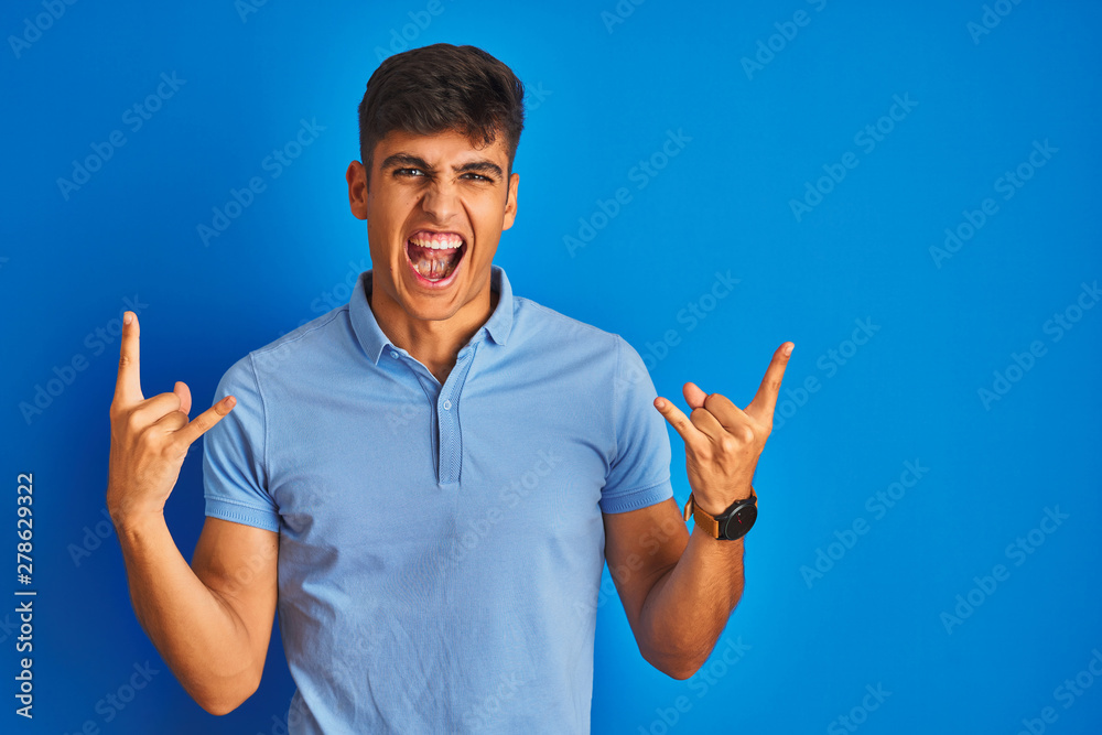 Young indian man wearing casual polo standing over isolated blue background shouting with crazy expression doing rock symbol with hands up. Music star. Heavy concept.