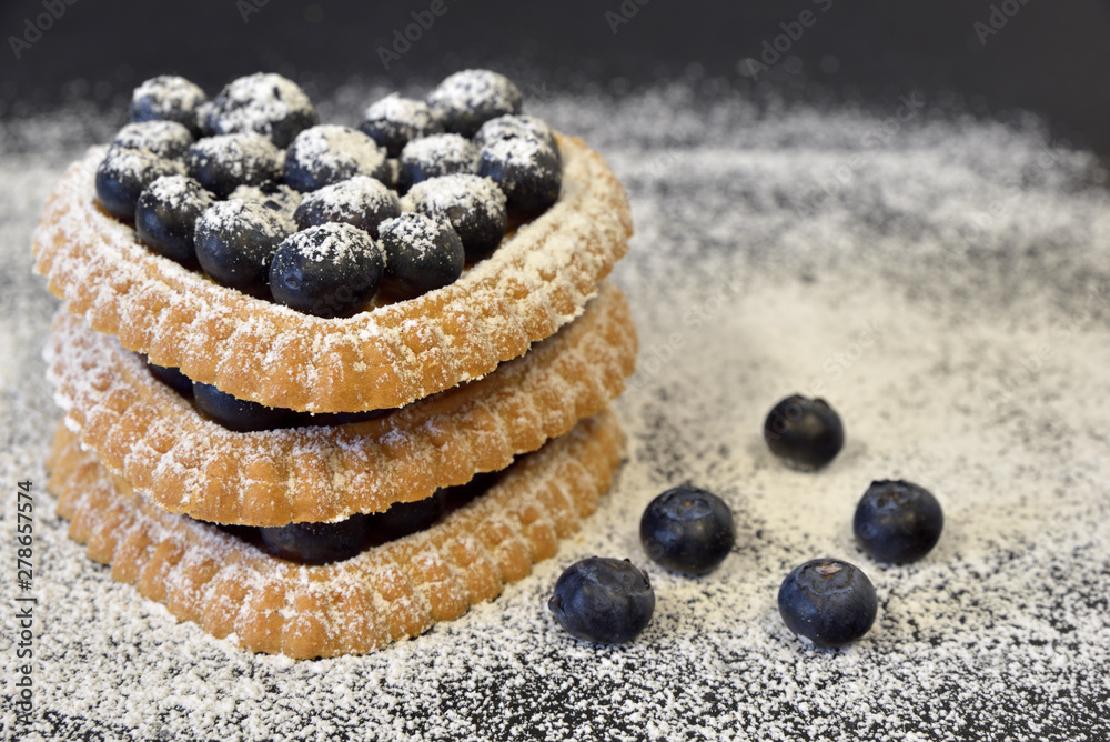 Tartlets of hearts and blueberries with powdered sugar on a dark platter