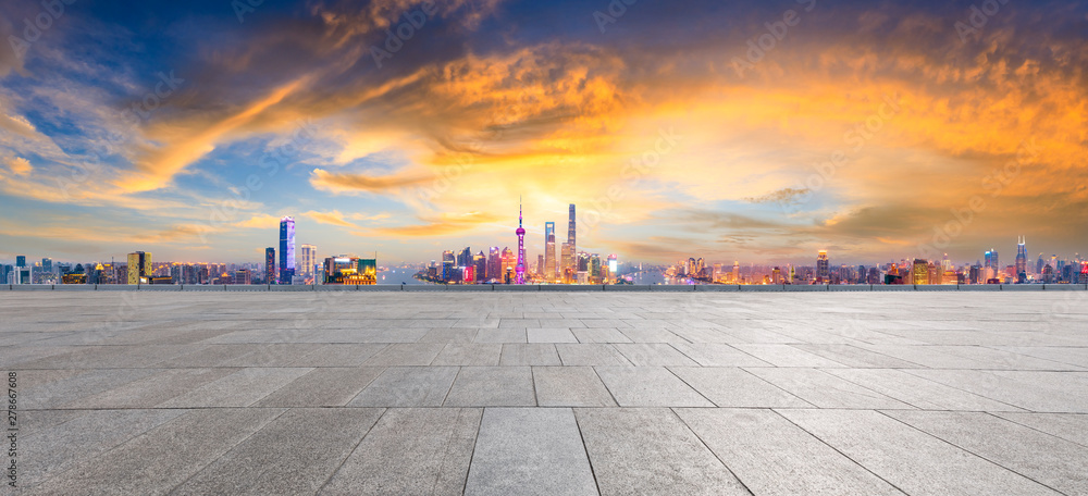 Empty square floor and modern city skyline in Shanghai at sunset,high angle view