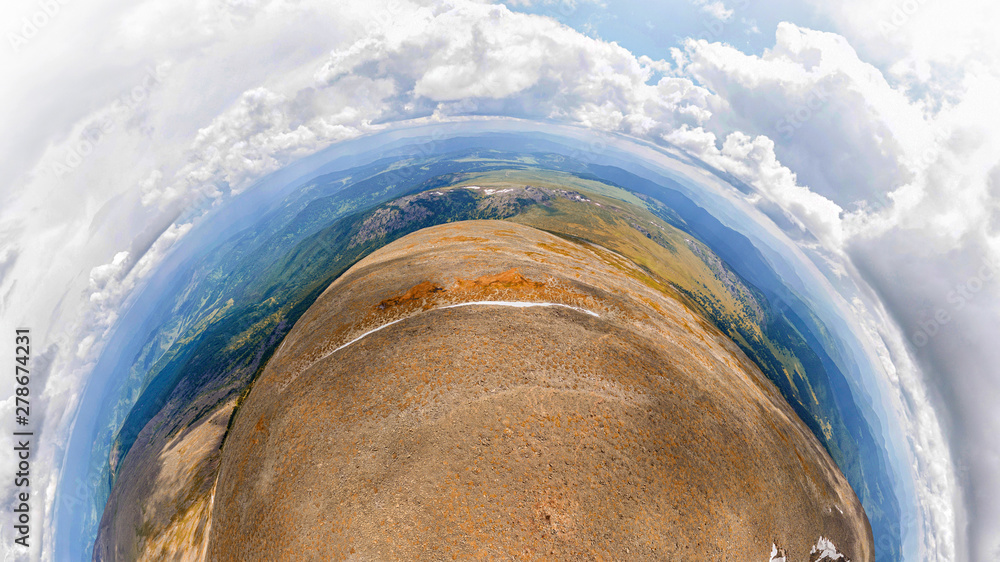 The landscape of the high point of the mountain is over two thousand kilometers above the ground level. Mountain panorama with a snow-free core, below a clear blue lake.