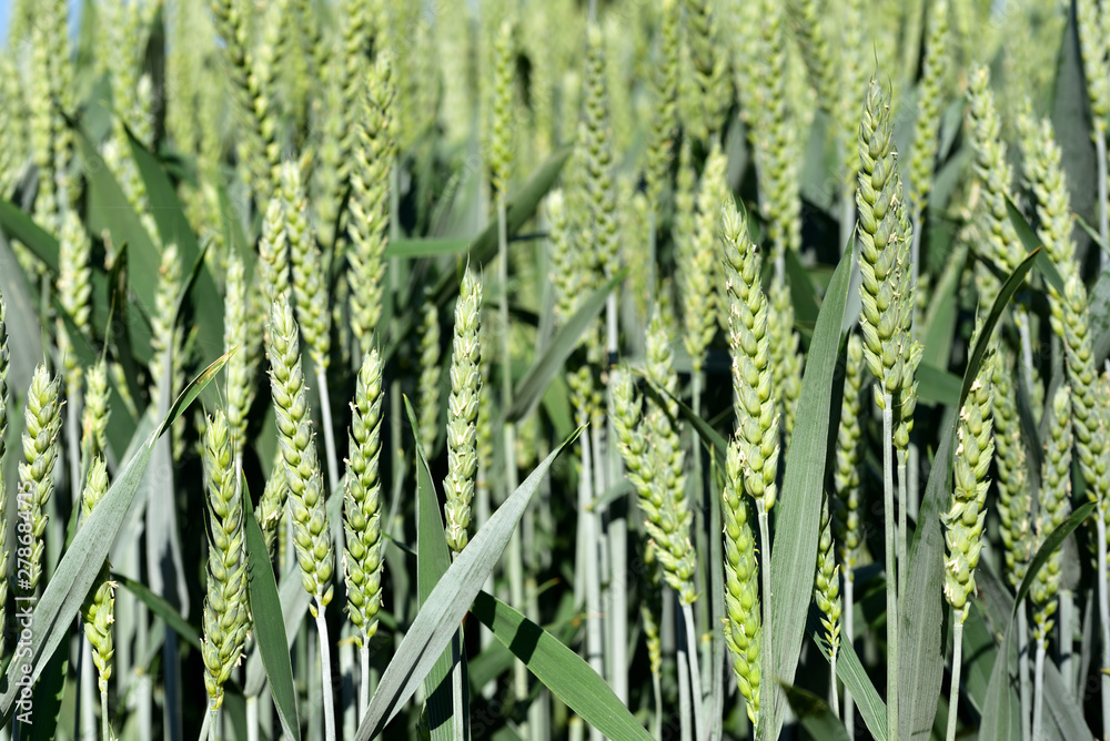 Background and texture of a wheat field with green, immature wheat ears in summer in Europe