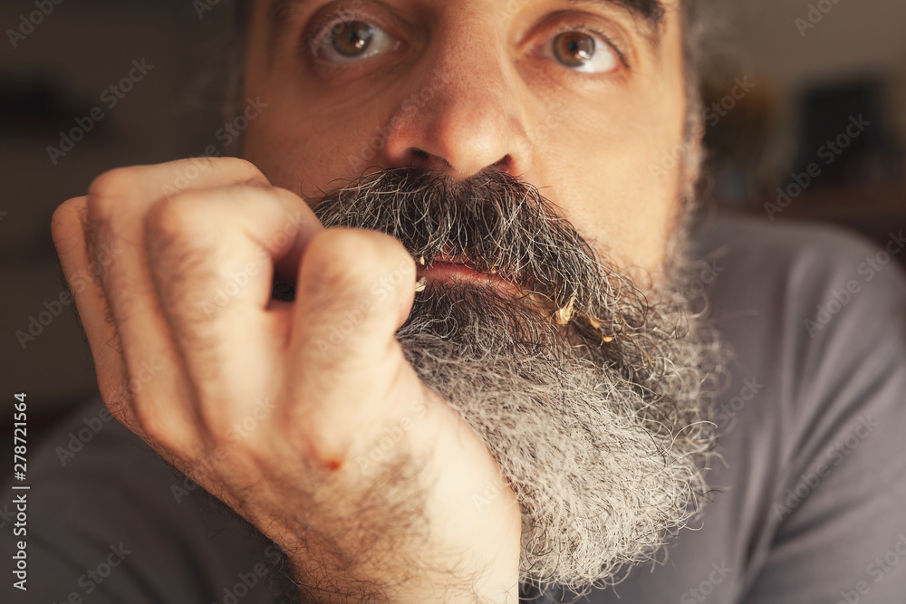 Bearded man sitting thoughtful, hand on the chin, with grey beard messy from eating, food leftovers in beard