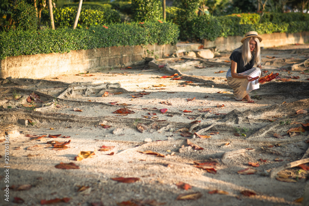 A blonde in a straw hat and long skirt gathers large leaves in a tropical park. Back view. Thailand travel