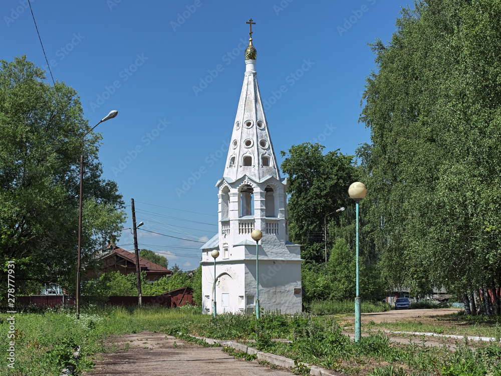 Belfry of Presentation Church in Bezhetsk, Russia. The belfry, built in 1680-1682, is the oldest surviving town's building and the only existing part of Monastery of Presentation of Virgin Mary.