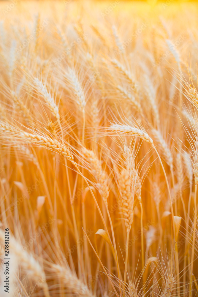 Close up of ripe wheat ears. Beautiful backdrop of ripening ears of golden field.