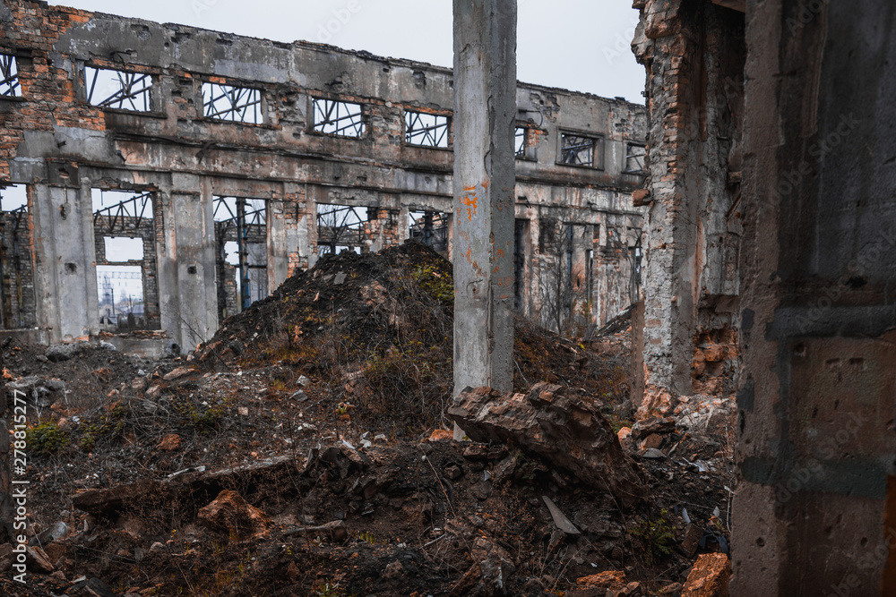 Ruins of industrial enterprise, dark debris destroyed factory premises in factory as result of economic crisis and earthquake.