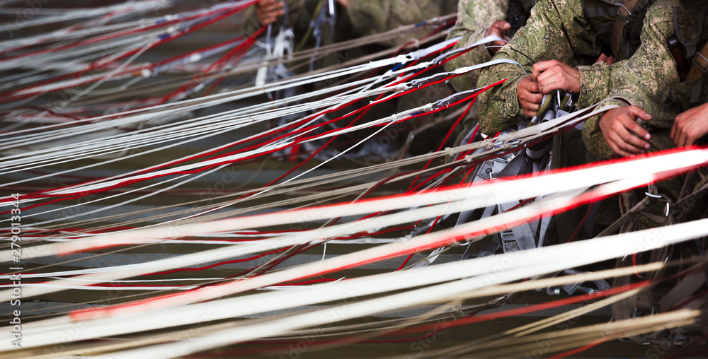 The hands of soldiers collect parachute lines. Preparing to jump. Army