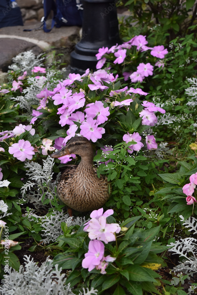 ave posando en flores