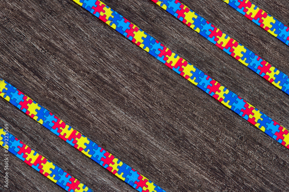 World Autism awareness day with Puzzle ribbon on wooden background