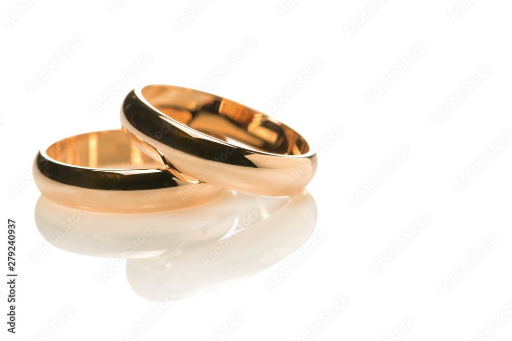 Gold wedding rings. Two engagement rings close up isolated on white background, macro jewelry for newlyweds with reflection.