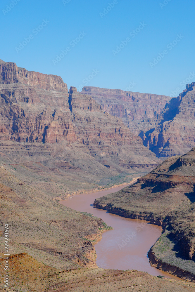 Picturesque landscape view of Grand Canyon National Park with Colorado river during sunny day. Arizona, USA. Famous travel destination.