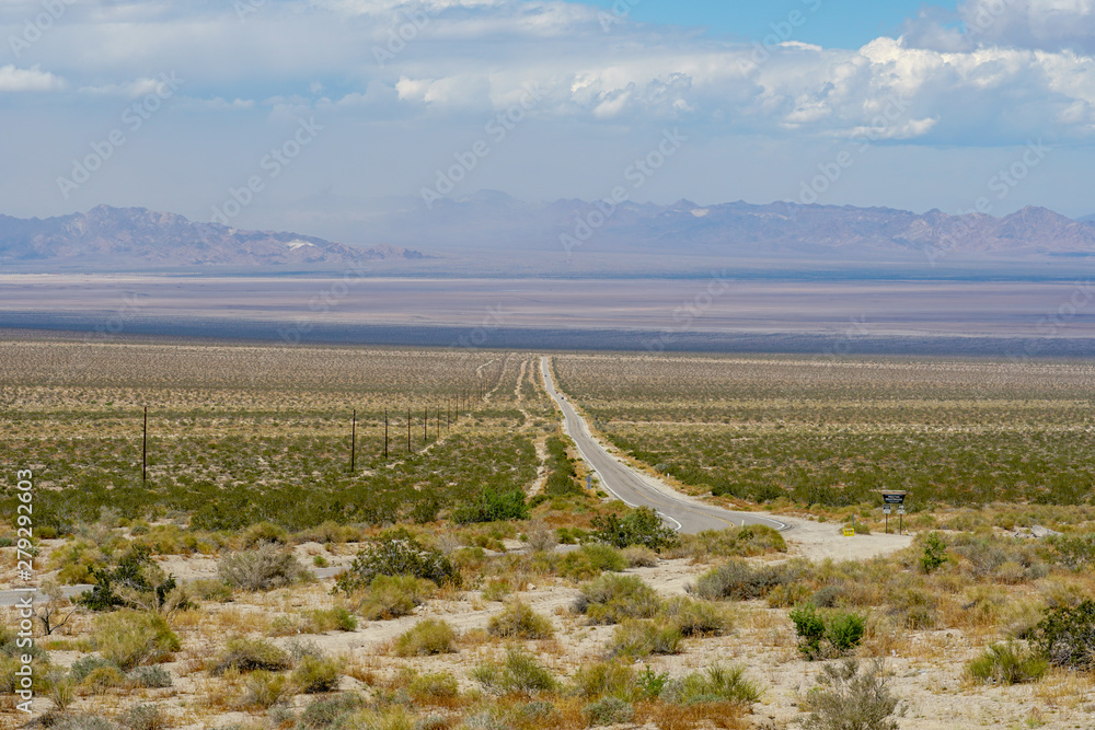 Endless desert straight road next Joshua Tree Park. USA. Long straight tarmac road heading into the desert to the direction of Arizona.