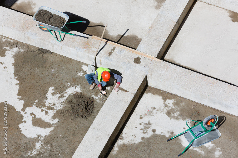 Uniformed workers clean sand on a construction site, top view.