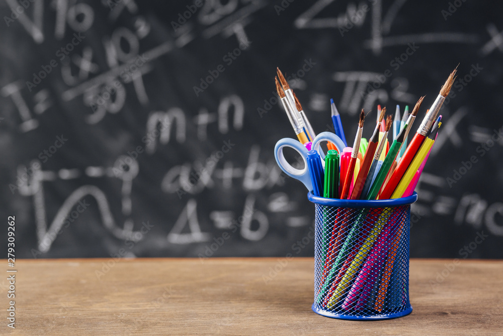 Blue pen stand with drawing tools placed on desk