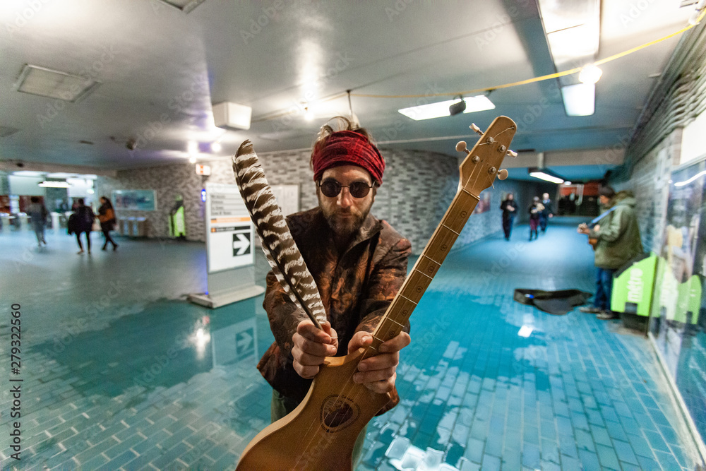 Shaman holds guitar in underground. A wide angled view of a city underground station with blurry pedestrians. A spiritual guy looks at camera and holds acoustic instrument and bird feather.