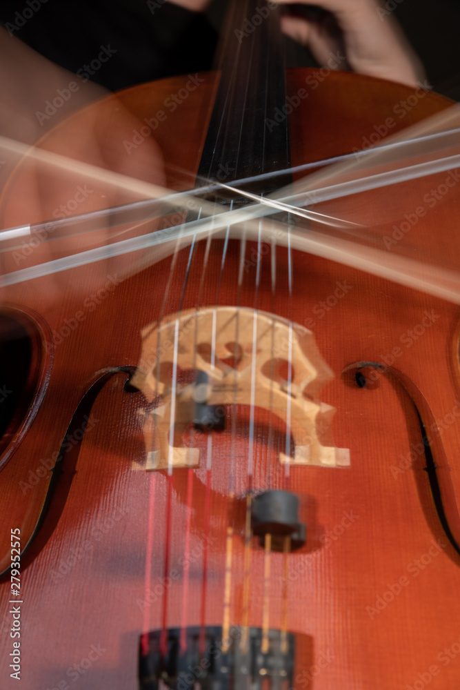 A young cellist practices intensely in this close up high resolution photo of strings, cello, and bow