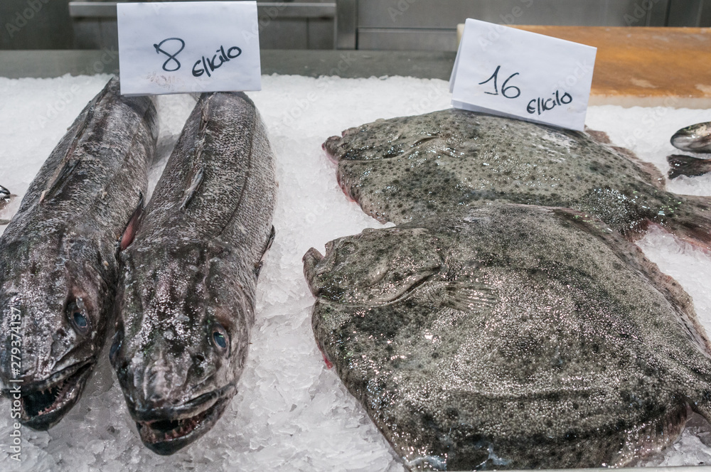 Fresh halibut and hake on ice at the market stall