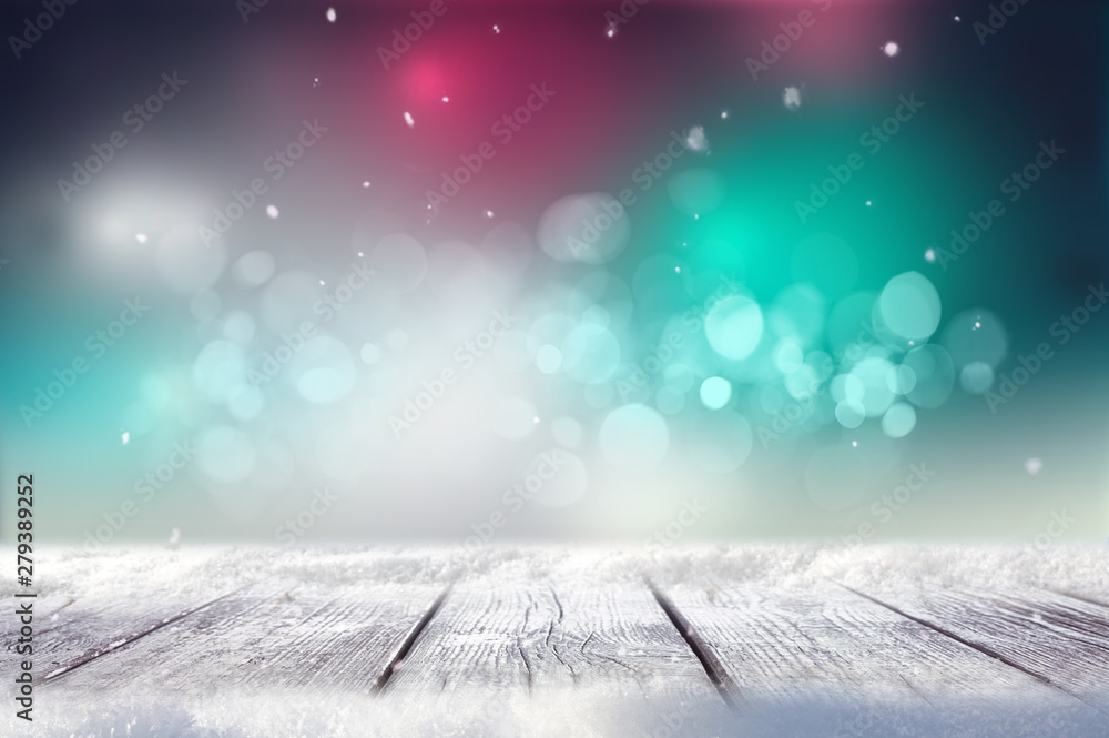 Festive Christmas stage scene background with wooden floor in snow and defocused Christmas lights. Blue and pink turquoise tones, evening, copy space.