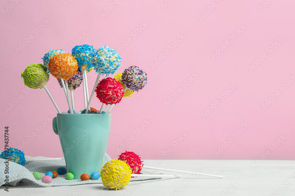 Cup with tasty cake pops on white table against pink background, space for text