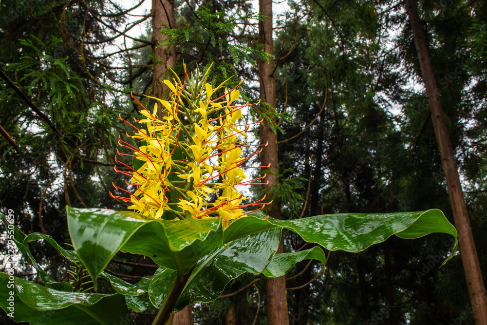 Conteira (Hedychium gardnerianum) flowers growing in the green forests on Sao Miguel Island, Azores, Portugal