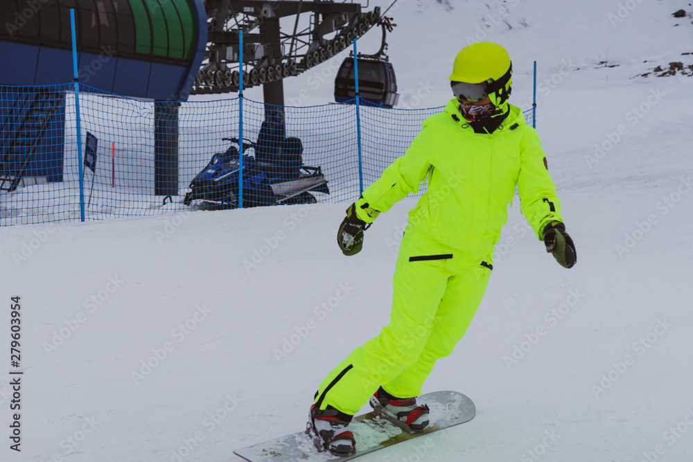 Snowboarder skiing in bright yellow suit, overalls