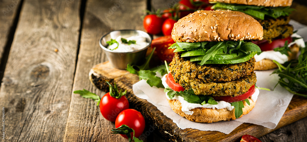 Vegan zucchini burger and ingredients on rustic wood background, copy space