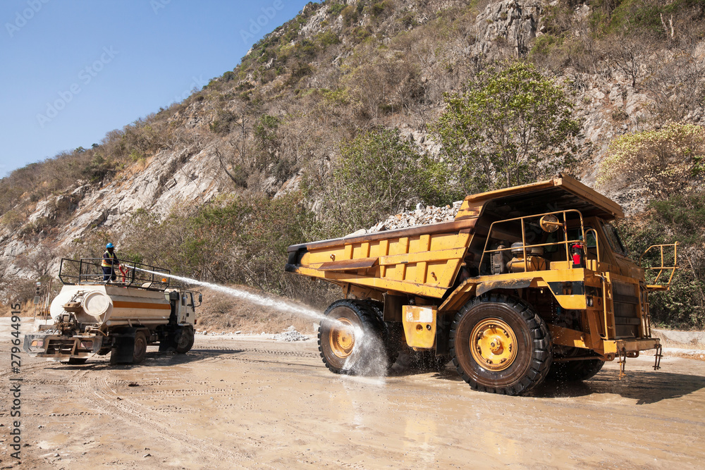 Male worker on water truck is spraying water on the large wheel truck.