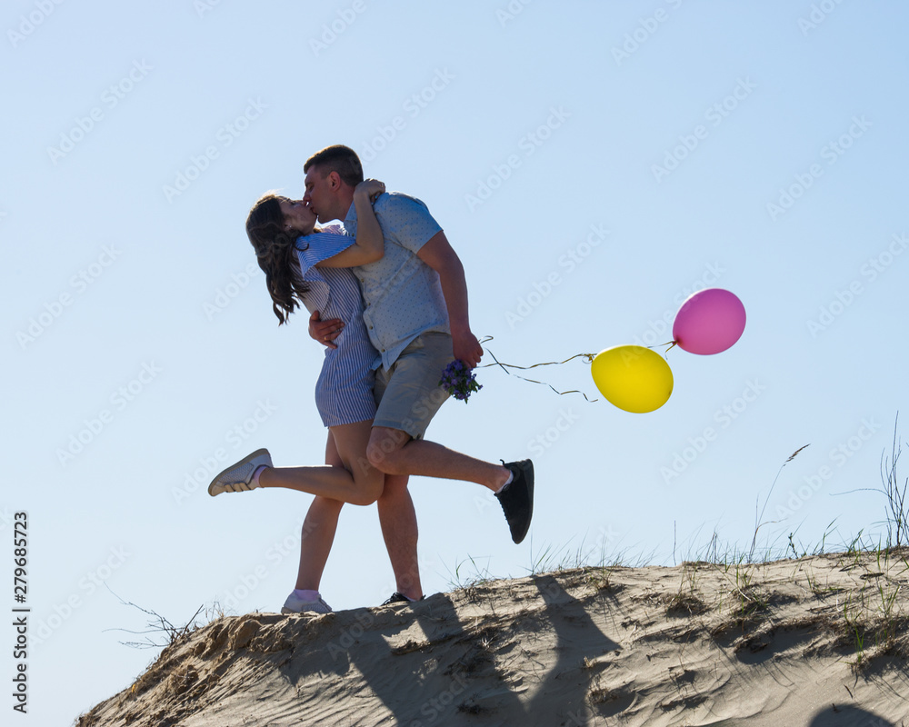 Couple of Lovers Kissing on Top of a Hill with Balloons in Hands.