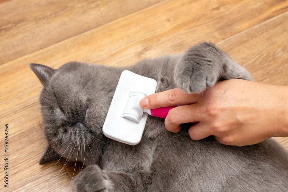 Grooming brushing gray pretty cute cat with a special brush for grooming pets care concept