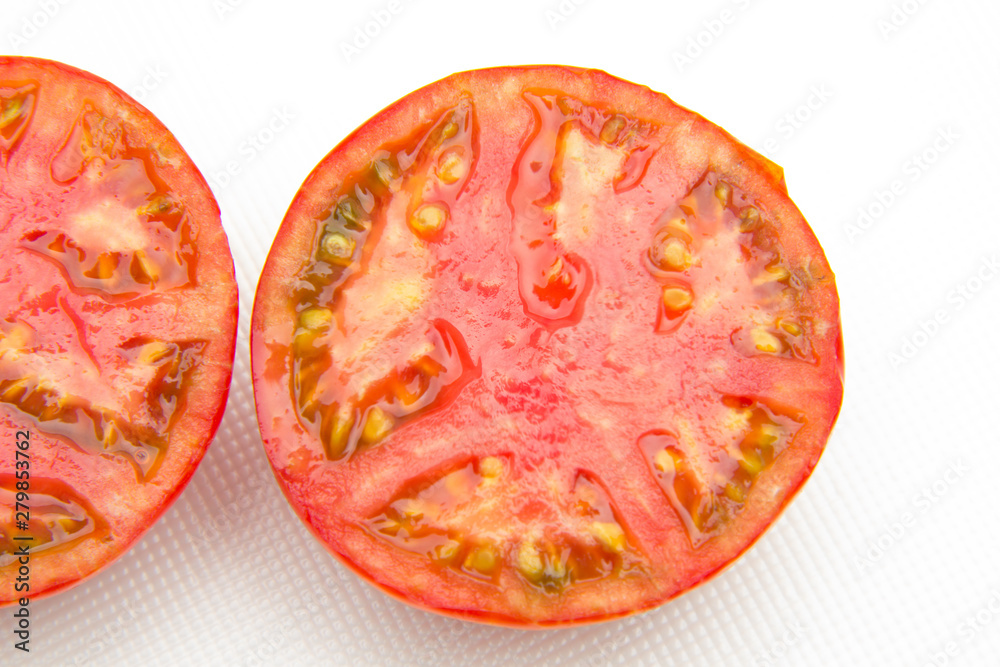 Primer plano de medio tomate, abierto por la mitad, en el que se ven las semillas