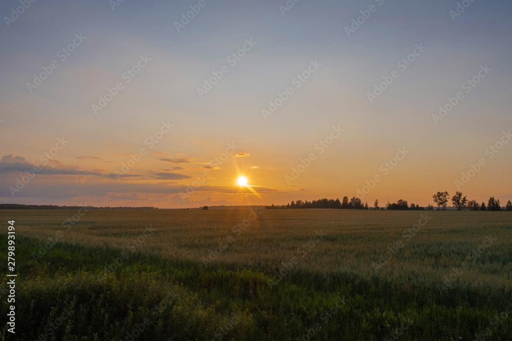 Yellow-orange disk of the setting sun over the horizon and a little cloudy.