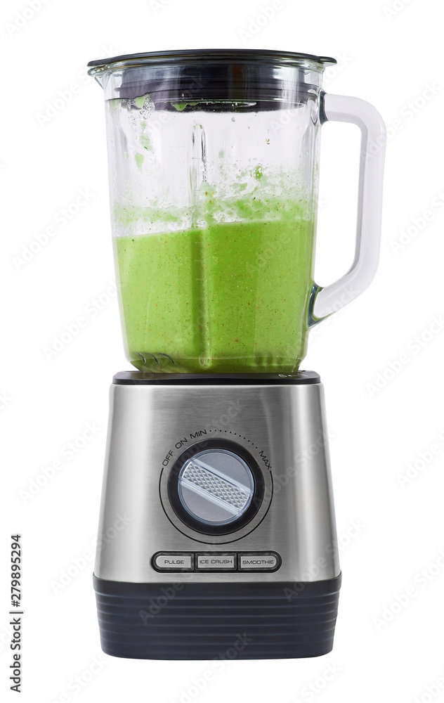 Modern stationary blender with ready green cocktail in a bowl isolated on white background.