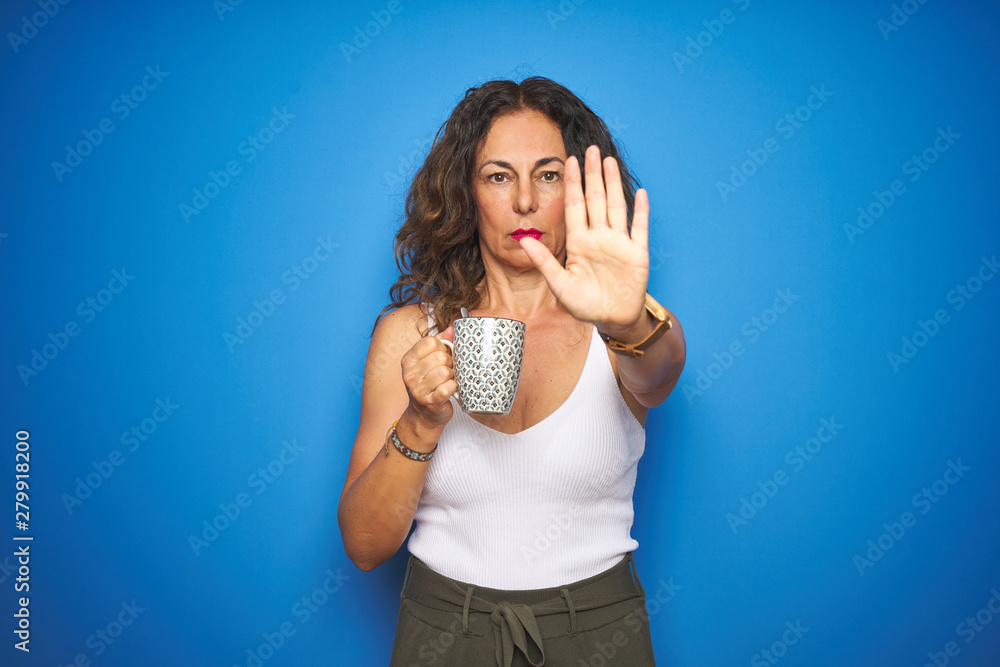 Middle age senior woman drinking a cup of coffee over blue isolated background with open hand doing stop sign with serious and confident expression, defense gesture