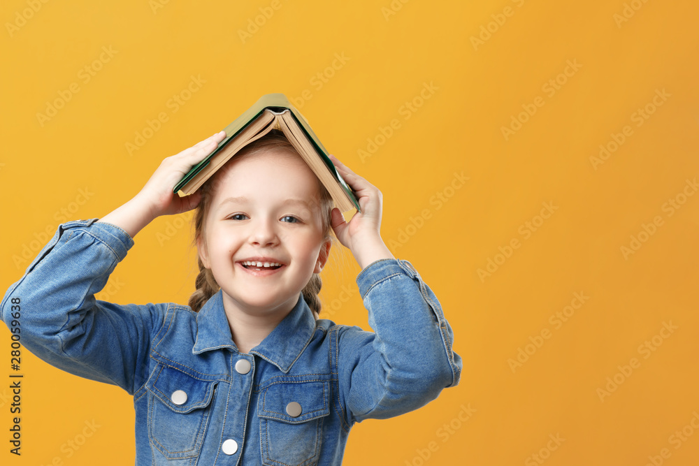 Portrait of a funny little girl on a yellow background. The student has a book on his head.