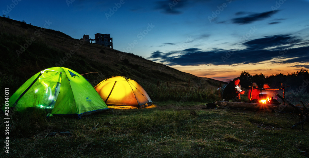 Summer evening in a hike. Glowing tents. Camping in a beautiful location. Sitting around the campfire.