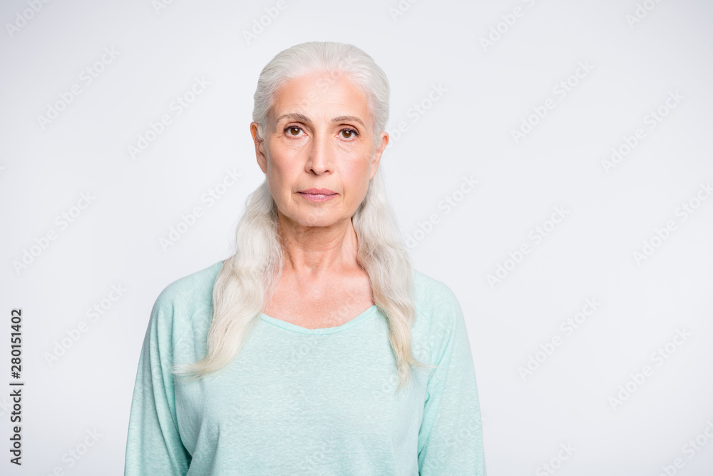 Portrait of concentrated charming woman looking wearing teal pullover isolated over white background