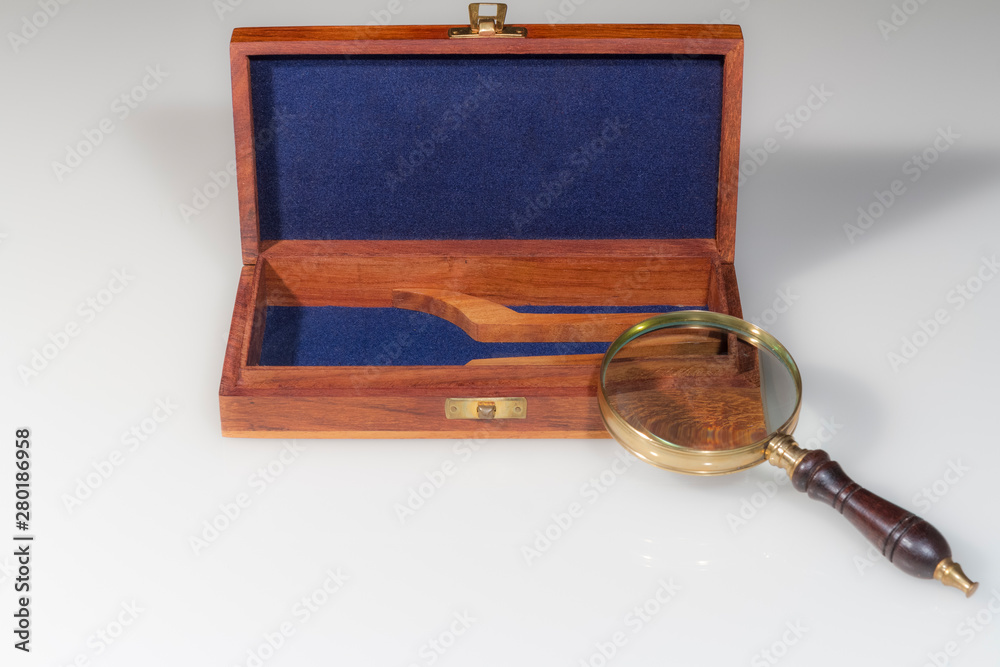 still life: office magnifying glass with wooden box