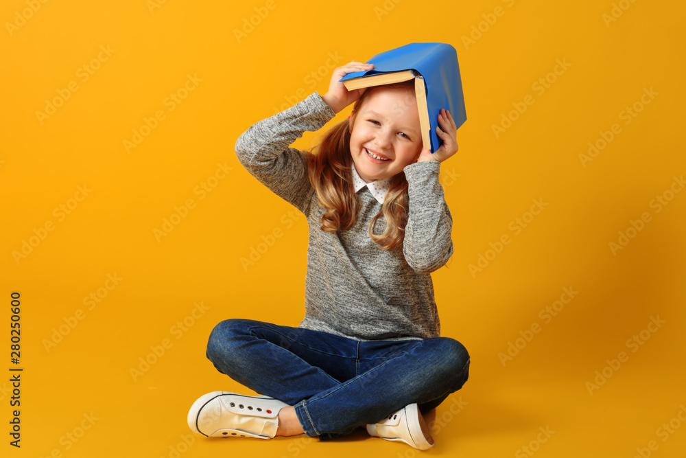 Cheerful attractive little student girl is sitting on the floor with a book on her head. The concept of education and school. Yellow background. Studio.