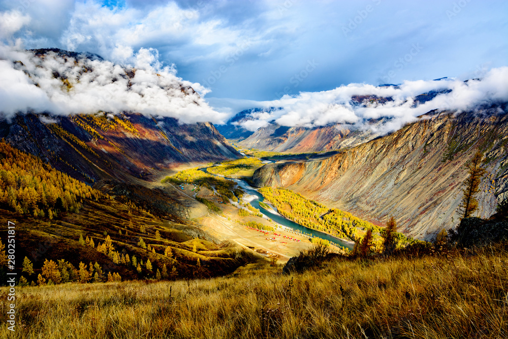 Mountain valley on a sunny morning. River flows through the valley. Mountains in clouds.