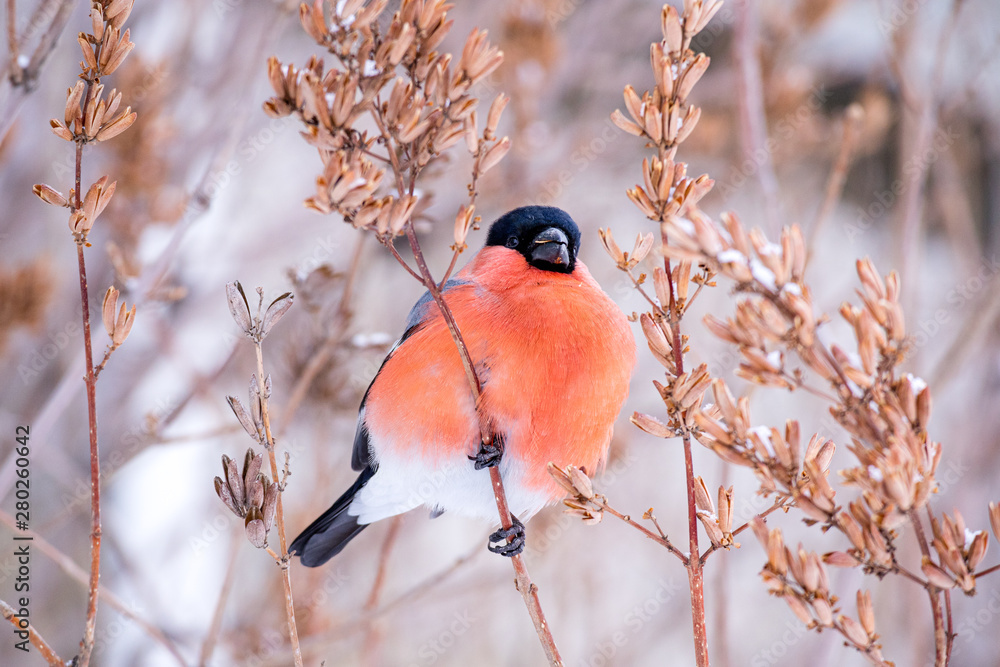 winter bird bullfinch on tree branches feeds on tree seeds