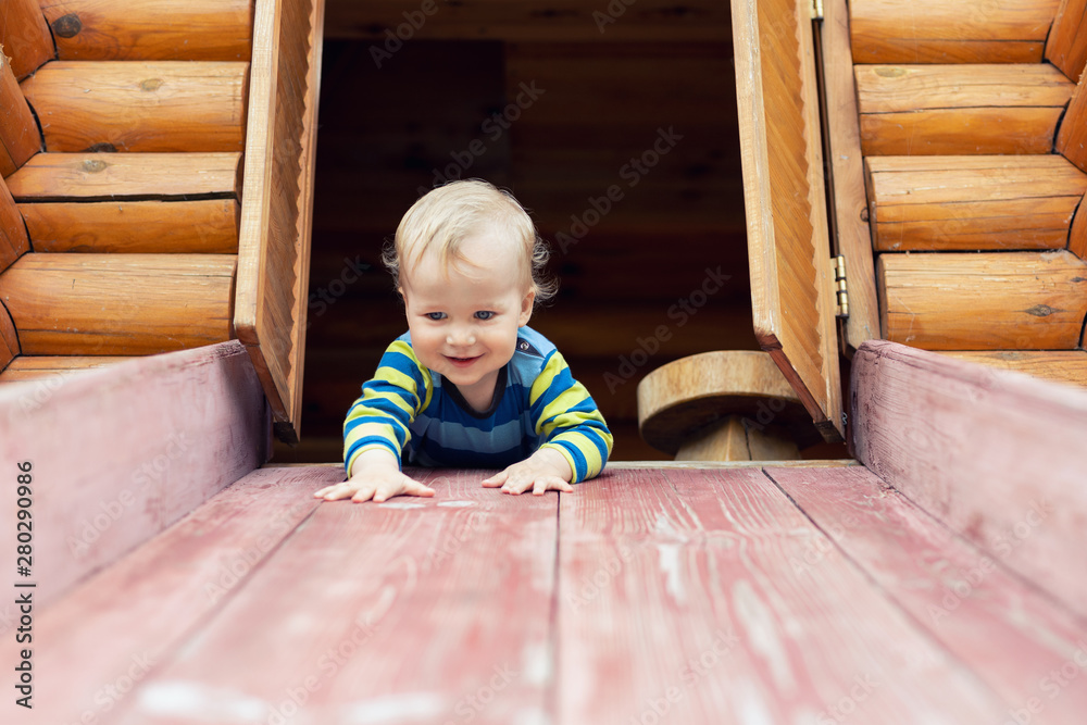 Cute adorable caucasian toddler boy having fun sliding down wooden slide at eco-friendly natural playground at backyard in autumn. Playful funny child portrait enjoying outdoor sport acitivities