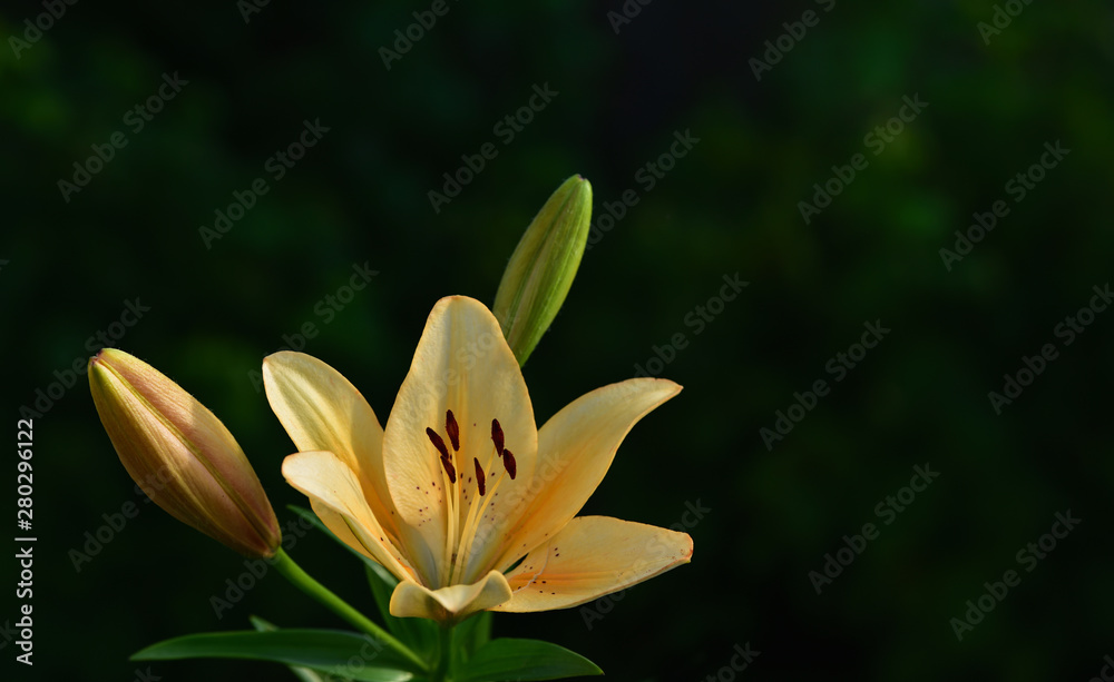 A yellow lily flowers in front of green background