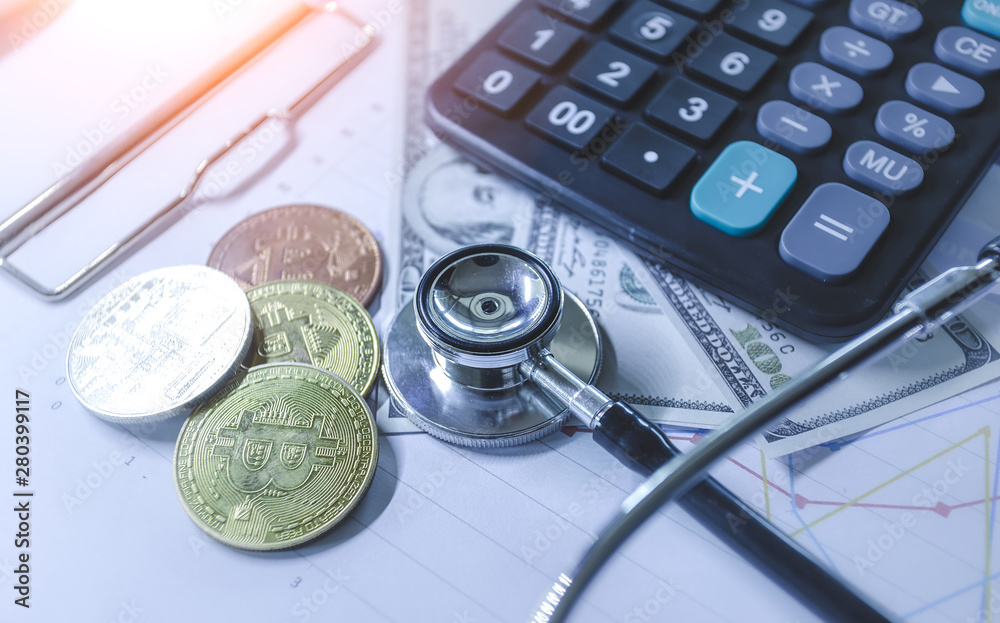 Financial analysis - Stethoscope on dollar and coins. business concept.
