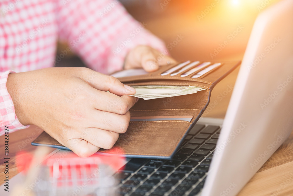 Girl with brown wallet full of money, female hands close-up hold a black purse in which dollars lie, Wallet Hands Credit Card Mobile Concept, shopping online concept