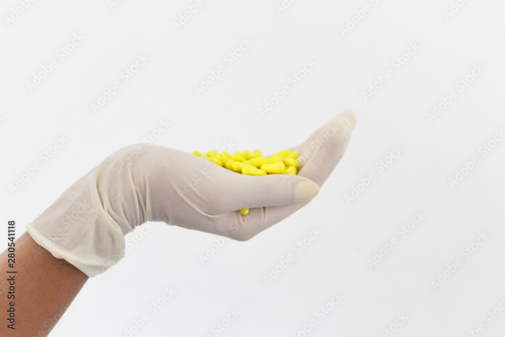 pills in hand, A hand in a glove holds yellow pills on a white background