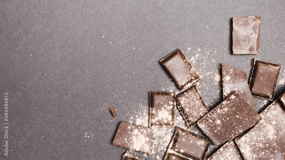 Top view chocolate tablets covered in cocoa powder