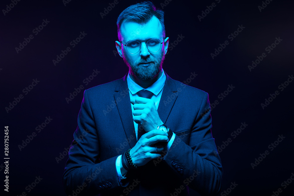 Young handsome model posing in a studio in a trendy neon light. Fashionable man in a stylish suit. Vibrant color. Bright colorful light effects. Disco style. Overlay. Gel filter. Supersaturated