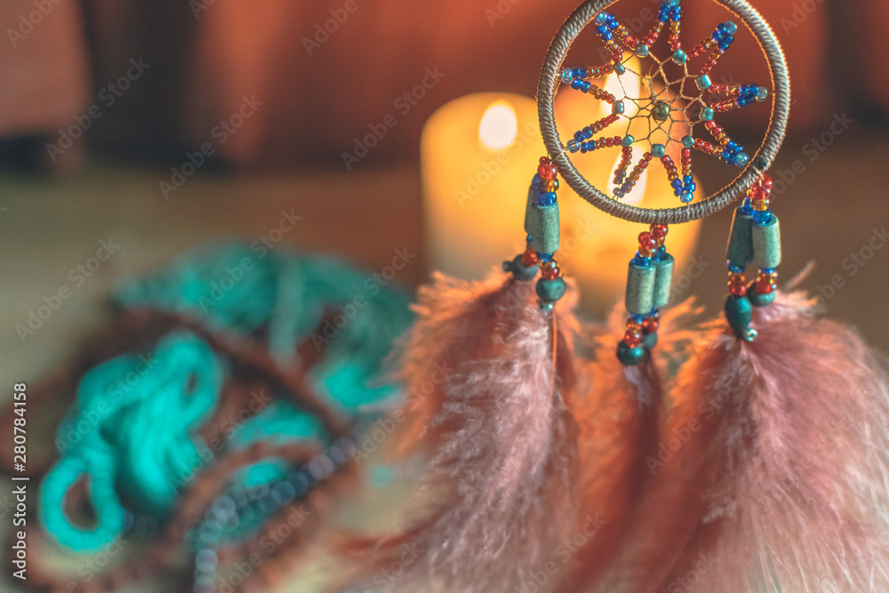 handmade dream catcher from beads and feathers on the background of burning candles. selective focus